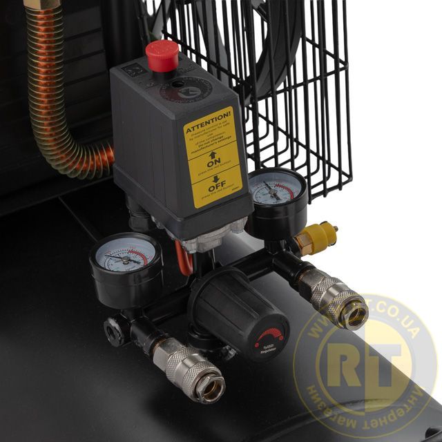 Для того, щоб можна було контролювати тиск у ресивері й тиск на виході, компресор оснащений двома манометрами з регулятором вихідного тиску.Регулятор тиску з манометром дозволяє регулювати та постійно підтримувати вихідний тиск, необхідний вашому інструменту або обладнанню.