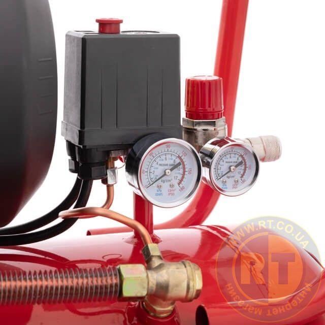 Для того, щоб можна було контролювати тиск у ресивері й тиск на виході, компресор оснащений двома манометрами з регулятором вихідного тиску. Регулятор тиску з манометром дозволяє регулювати та постійно підтримувати вихідний тиск, необхідний вашому інструменту або обладнанню.