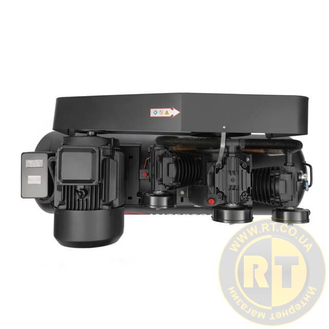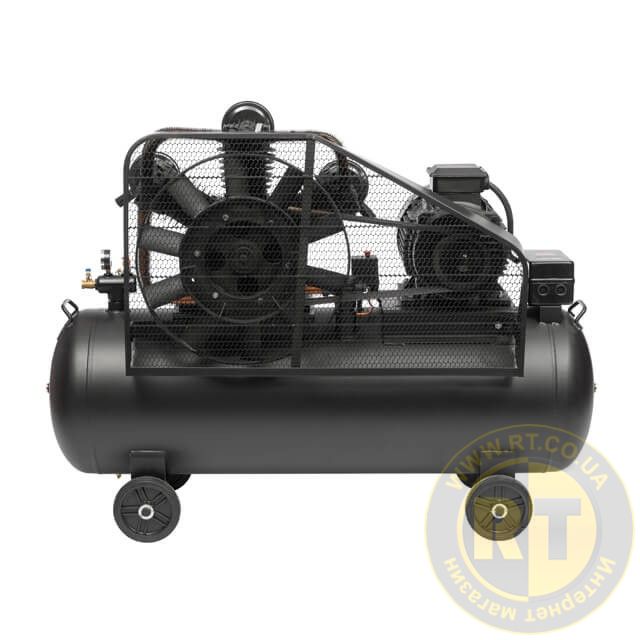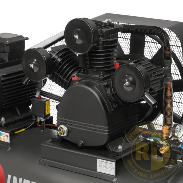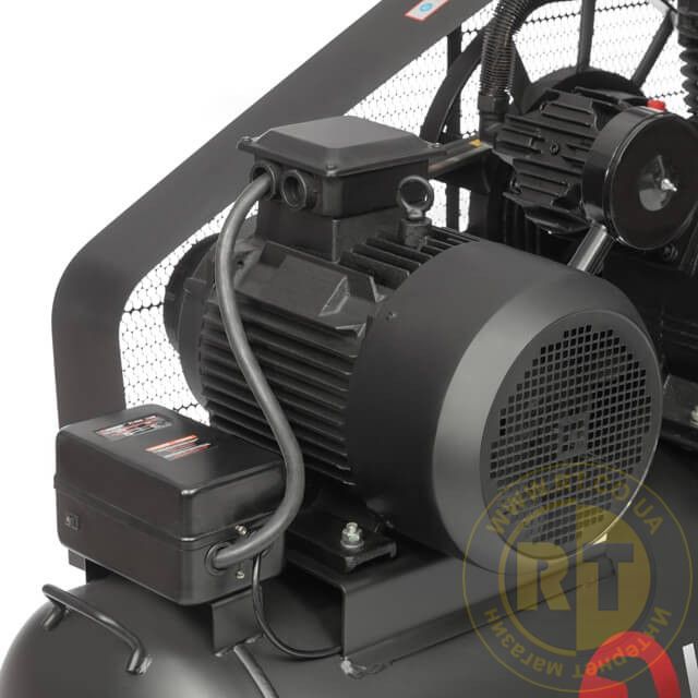 Компресор має ремінний привід від електродвигуна до голови з трьома сталевими циліндрами. Це забезпечує ефективне охолодження та зменшує навантаження на двигун.Мідна обмотка двигуна загалом збільшує ресурс служби, підвищує міцність та витривалість компресора, що підтверджує гарантія 3 роки.