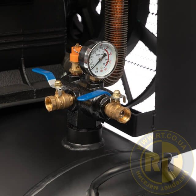 Для того, щоб можна було контролювати тиск, компресор оснащений манометром.Контроль подачі стисненого повітря безпосередньо з ресивера здійснюється за допомогою двох шарових кранів.