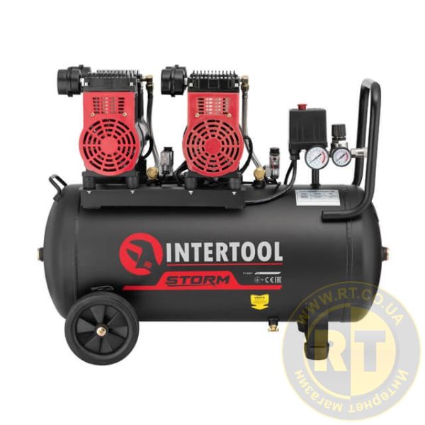 Компресор, 50 л, 2×1,1 кВт, 220 В, 8 атм, 320 л/хв, 1400 об/хв, малошумний, безмасляний, 4 циліндри, 68 дБ INTERTOOL PT-0027