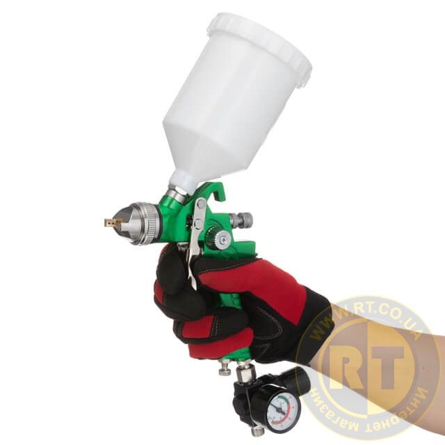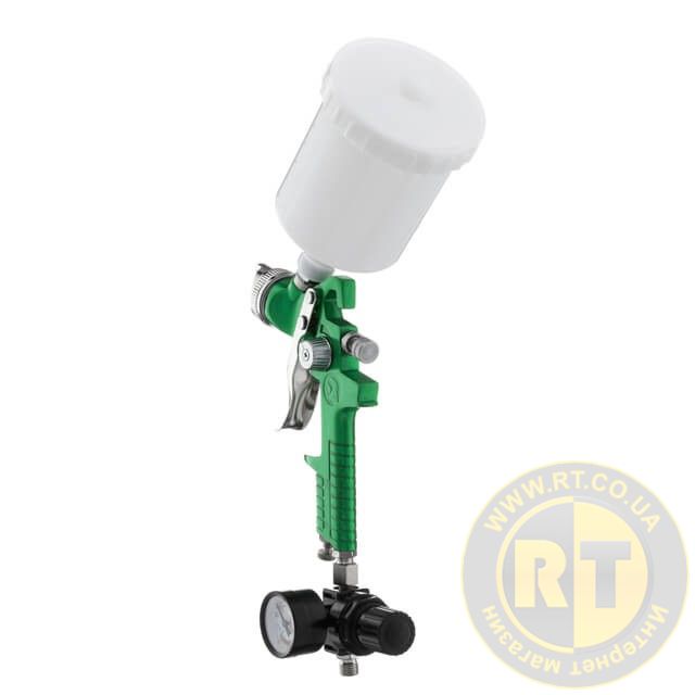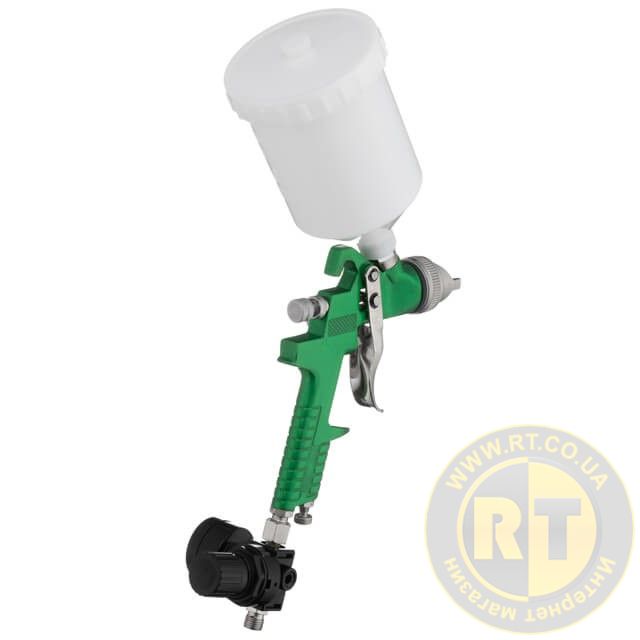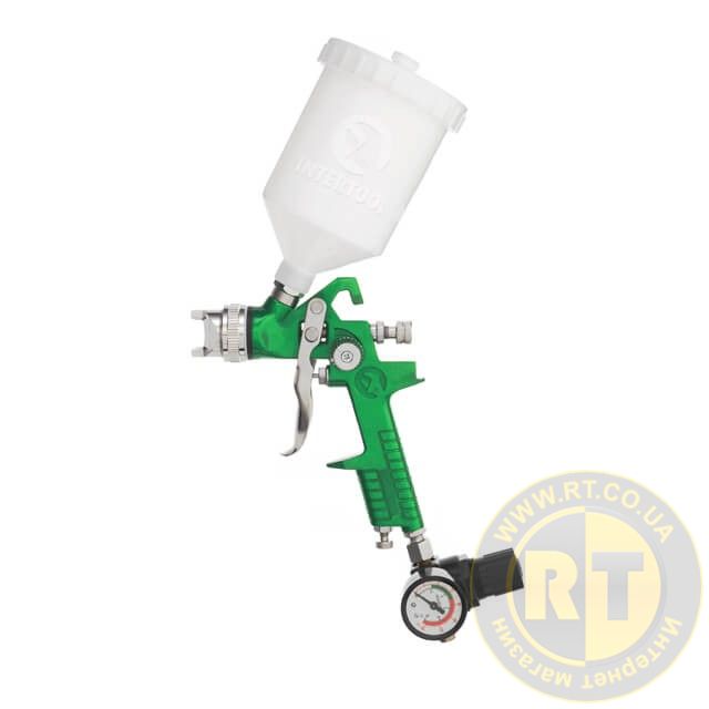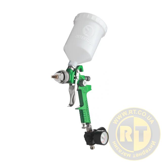 Краскопульт пневматичний HVLP, форсунка: 1,3 мм, верхній пластиковий бачок: 600 мл, 3 бар + редуктор INTERTOOL PT-0102