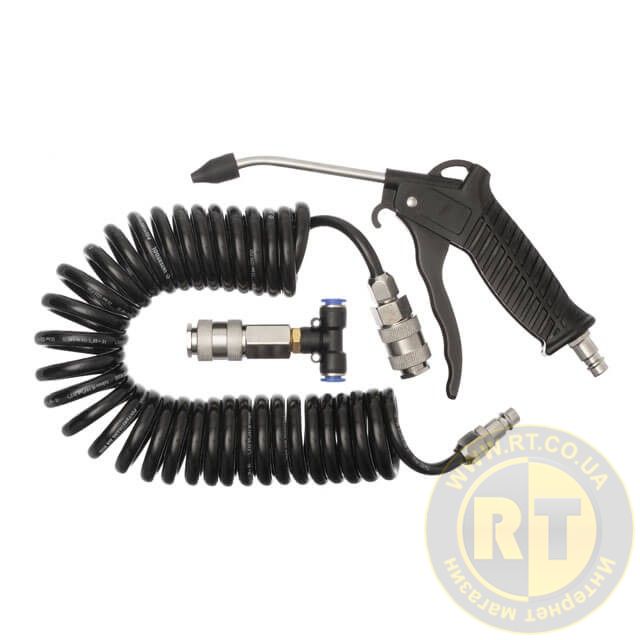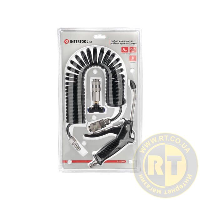 Набір для продувки кабіни вантажних авто: пістолет, шланг поліуретановий 5 м 8×5 мм, трійник на шланг 8 мм, на швидкороз'ємних з'єднаннях INTERTOOL PT-1508