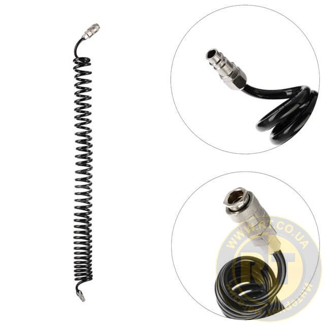 Шланг повітряний з поліуретану використовується для повітряних магістралей пневматичного обладнання. Шланг дуже гнучкий та здатний розтягуватися до 5 метрів, а у згорнутому вигляді займає мінімум місця, не плутається під ногами. Виготовлений з поліуретану, він дуже легкий, стійкий до стирання, зносу, мастил та жиру. Стіни шланга витримують робочий тиск до 15 атм. Завдяки спеціальним спіральним обмежувачам на кінцях шланга забезпечується цілісність виробу, він захищений від заломів та можливих пошкоджень. Стійкий до низьких температур, не твердне на морозі та залишається таким же гнучким.