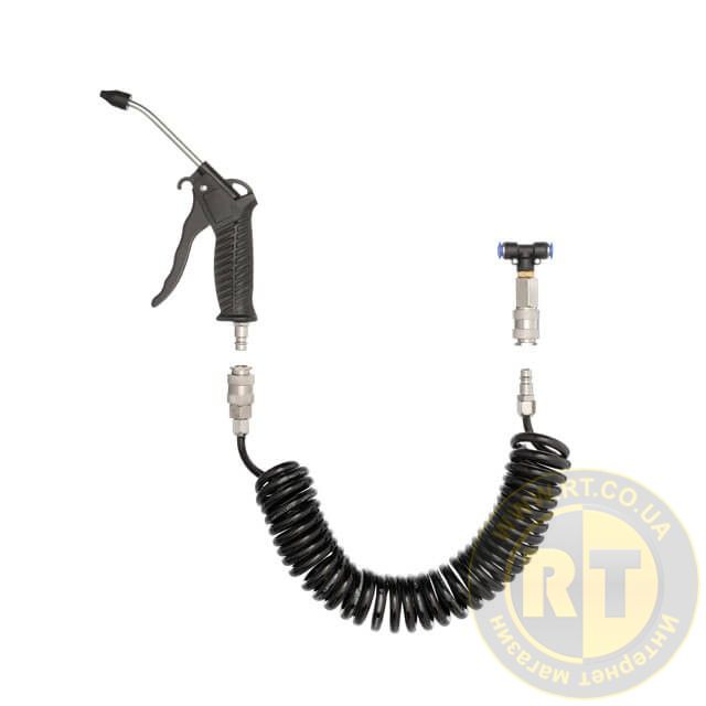 У комплекті передбачений трійник на шланг 8 мм, він допоможе у збиранні пневматичної системи. Крім цього, шланг комплекту оснащений швидкороз'ємним з'єднанням європейського типу, а пістолет продування відповідним фітингом, що дозволяє швидко під’єднати пневмоінструмент до шланга, а шланг - до компресора.