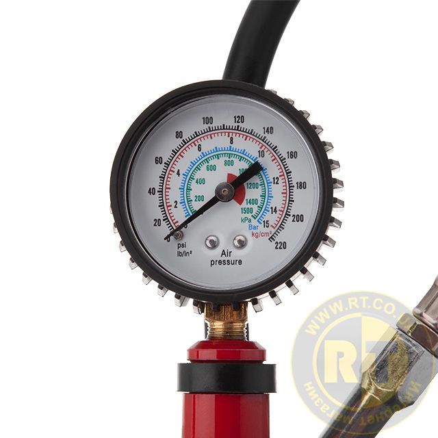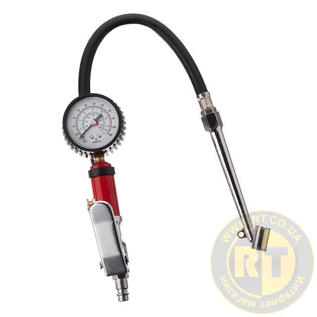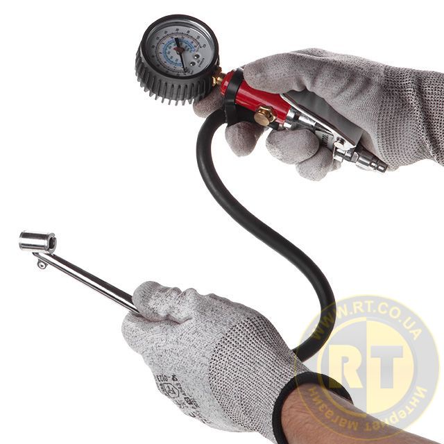 Інструмент оснащений манометром для контролю тиску та клапаном скидання повітря, коли необхідно спустити тиск до потрібного показника. Манометр з двома шакалами PSI та bar для зручності зчитування показників.