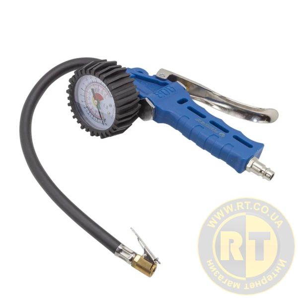Підключення через євро-штуцер (рапід) забезпечує зручне та швидке приєднання до пневмолінії, а гнучкий шланг довжиною 320 мм дозволяє працювати з важкодоступними колесами. Вбудований клапан скидання тиску дає можливість легко регулювати тиск у шинах, а гумовий кожух захищає манометр від пошкоджень при падінні та ударі.