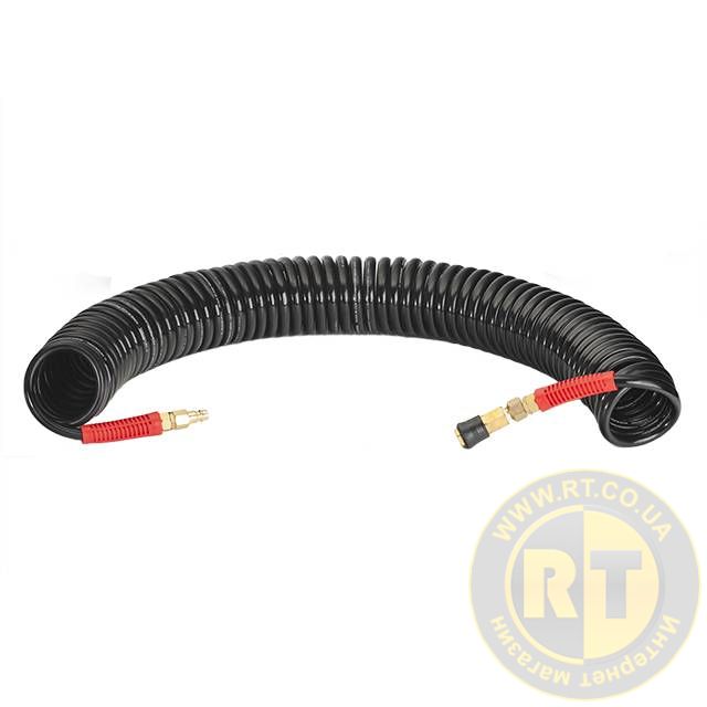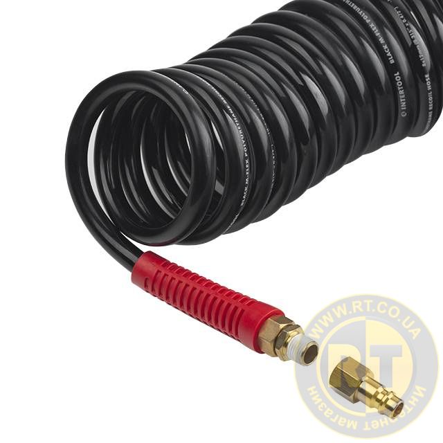 Шланг BLACK M-Flex 8×12 мм, 15 м, спіральний поліуретановий, з поворотним шарніром, латунними швидкороз'ємними з'єднаннями, STORM INTERTOOL PT-1797