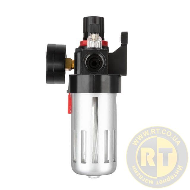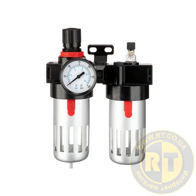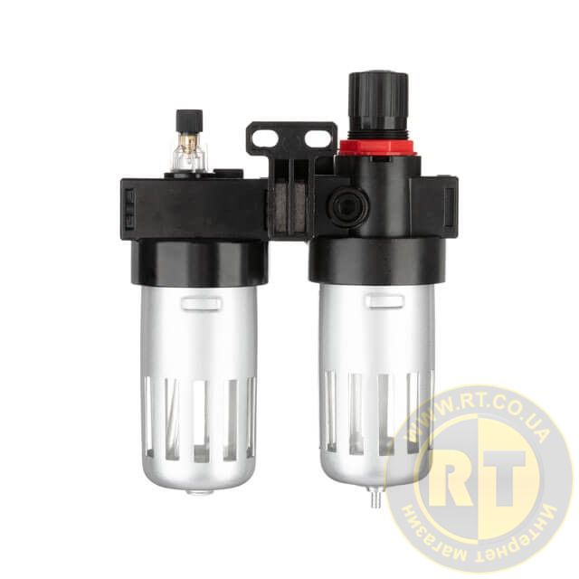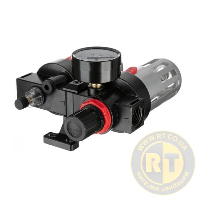 Блок підготовки повітря 1/2", 20 мкм, до 12 атм, до 1200 л/хв, металевий захист колби, регулятор тиску INTERTOOL PT-1430