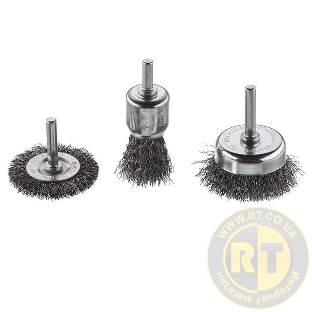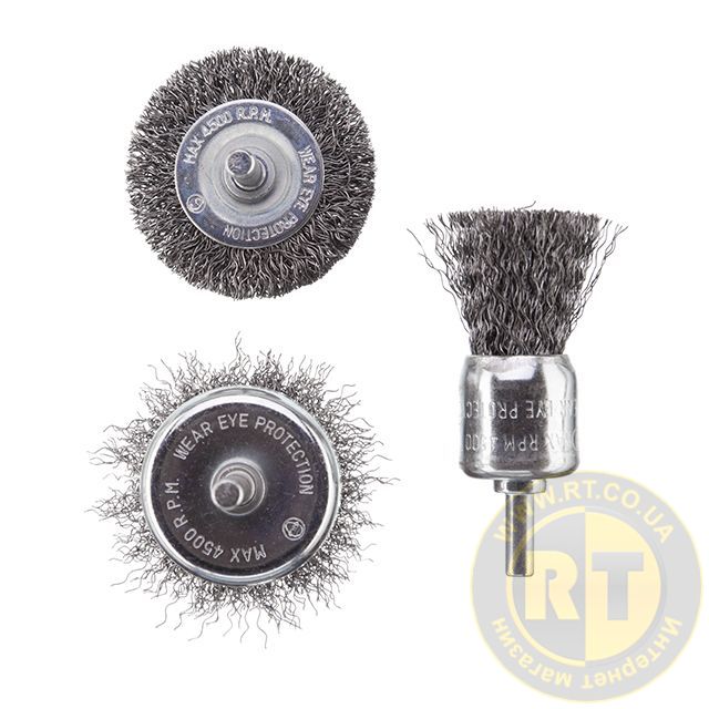 Набір складається з трьох щіток, спеціально розроблених для швидкого очищення та шліфування різних поверхонь: металу, цегли, каменю, дерева тощо. Ідеально підходять для використання з дрилями зі швидкістю обертання 4500 об/хв. Такі дротяні щітки забезпечують чудову якість зачищення навіть у важкодоступних місцях.