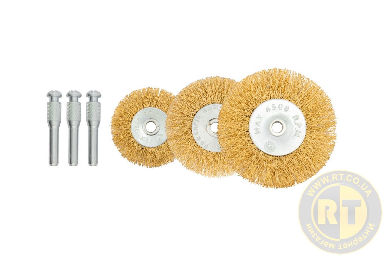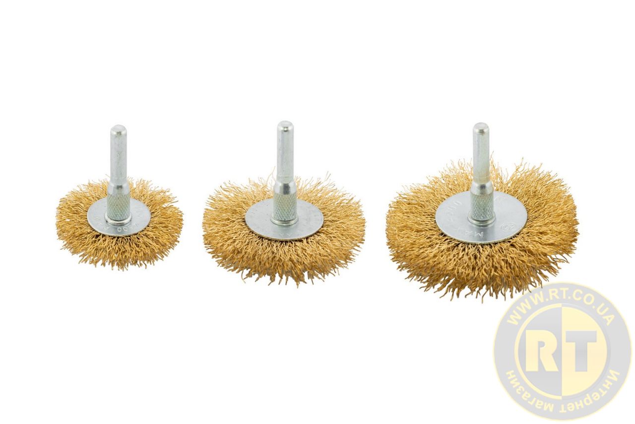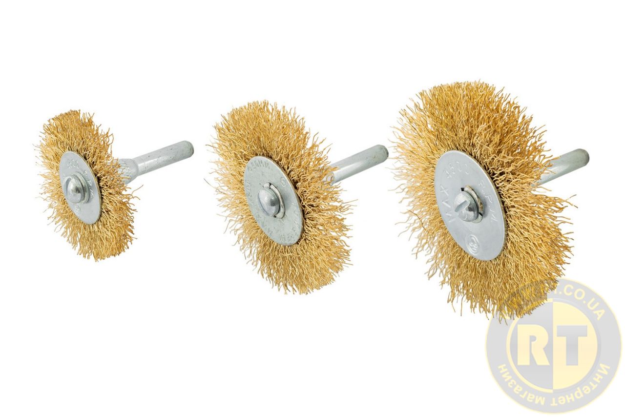 Набір щіток 3 шт – дискові зі стрижнем ¼" діаметром 50/63/75 мм, виготовлені з латунованого рифленого дроту, призначені для ефективного очищення та обробки різних поверхонь.
