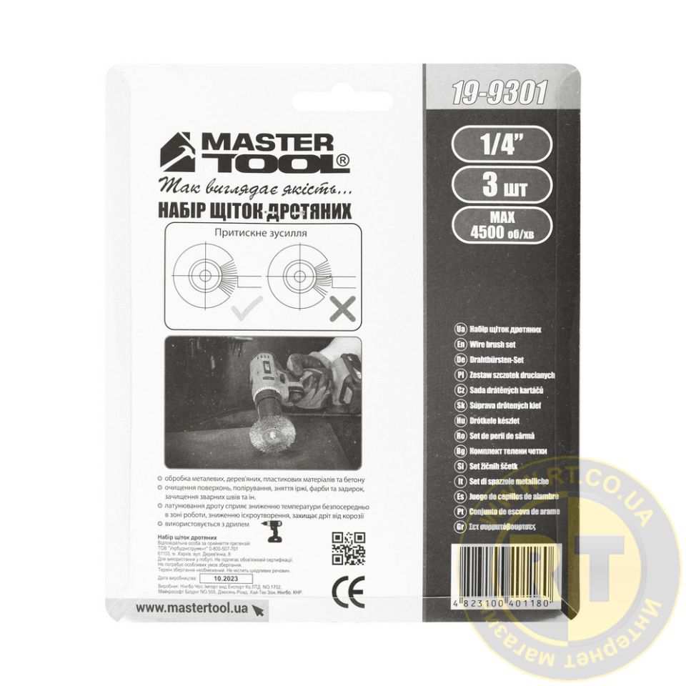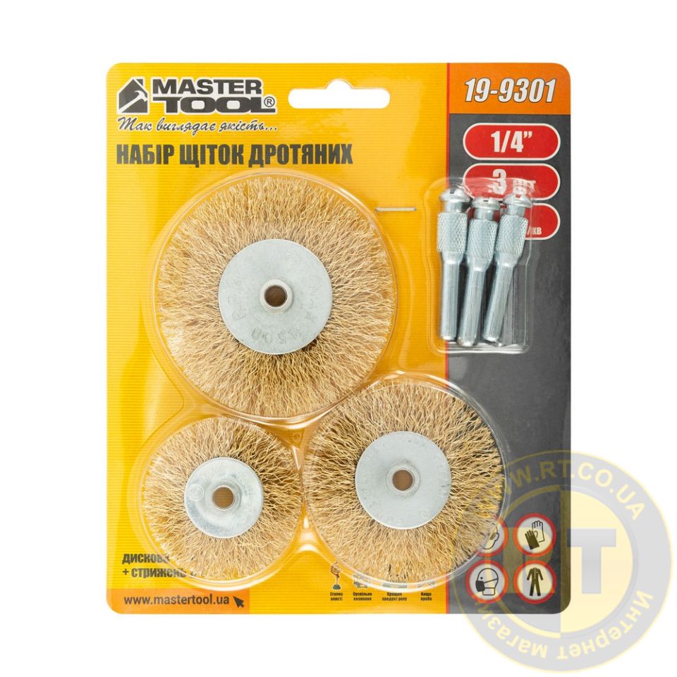 Набір щіток 3 шт - дискові зі стрижнем ¼" з латунованого рифленого дроту Ø 50/63/75 мм MASTERTOOL 19-9301