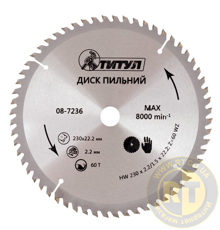 Диск пильний для дерева з твердосплавними напайками 230х22.2х60Т MASTERTOOL 08-7236