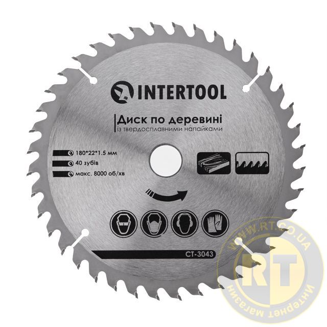 Диск по деревині, з твердосплавними напайками, 180×22,2×1,5 мм, 40 зубів, 8000 об/хв INTERTOOL CT-3043