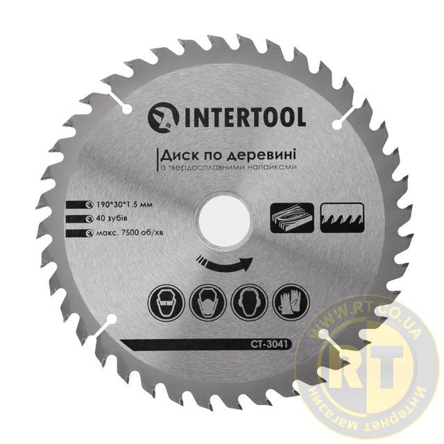 Диск по деревині, з твердосплавними напайками, 190×30×1,5 мм, 40 зубів, 7500 об/хв INTERTOOL CT-3041