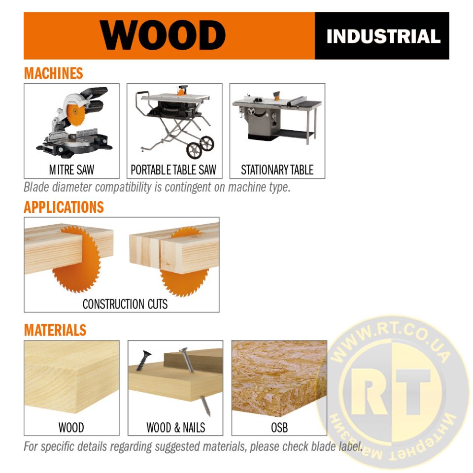Універсальні пильні диски для будівництва. Використовується на ручних циркулярних пилках та циркулярних станках. Підходити для розпилювання м'якої або твердої деревини з включеннями цвяхів, металевої фурнітури та бетону. При роботі з цим диском досягається потрібна швидкість розпилу та ефективність.