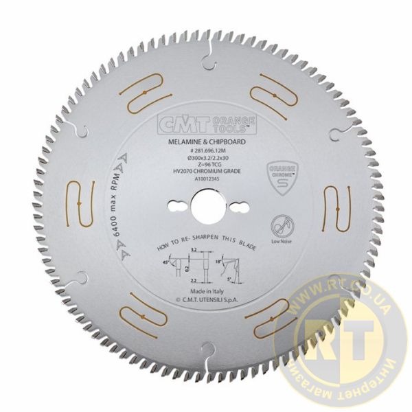 Малошумний диск із хромовим покриттям, встановлюється на горизонтальний або вертикальний форматно-розкрійний станок з підрізним вузлом і використовується для розкрою панельних матеріалів без сколів. Призначень для торцювання ЛДСП, МДФ, можливий поперечний різ деревини. Зуби виготовлені з твердого сплаву з вмістом хрому, форма зубів: трапеція-рівня. Спеціальне заточування та хромоване покриття збільшує тривалість використання диска. При створенні даних дисків застосовується технологія вальцювання корпусу, яка задає необхідний натяг у корпусі, що забезпечує стабільність пиляння та зниження радіального биття. Прорізи в корпусі заповнені спеціальним матеріалом з поліуретаном, для зниження вібрації та шуму при роботі. Даний пильний диск має ідеально просвердлений, шліфований посадковий отвір з фаскою, що забезпечує відсутність вібрації та ідеальний оброблюваний край. Диск із збільшеним ресурсом володіє міцністю, стійкістю до сколів, високою продуктивністю та тривалим терміном експлуатації.