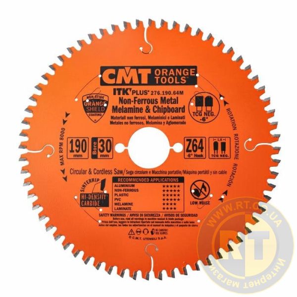 Пили серії ITK PLUS із тонким пропилом для кольорових металів та композитного настилу. Оптимальні для робіт з алюмінію, міді, латуні та інших матеріалів що не містять заліза. Основною особливістю є висока ударна в'язкість зубів зі спеціального сплаву. Негативний угол врізання -6° дозволяє контролювати процес пиляння і залишати гладкі акуратні краї заготовки. Спеціальна конструкція пазух для ефективного видалення стружки. PTFE покриття диска, з вмістом тефлону, запобігає налипанню нагару на корпус.