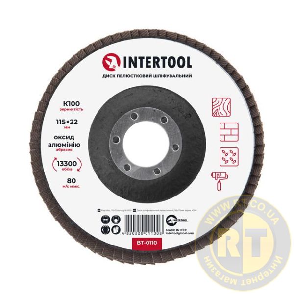 Диск шліфувальний пелюстковий, 115×22 мм, зерно K100, 13300 об/хв INTERTOOL BT-0110