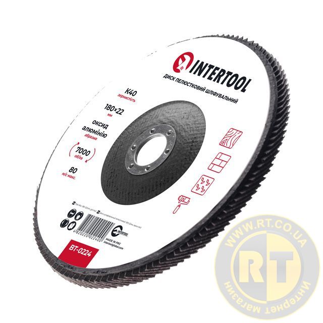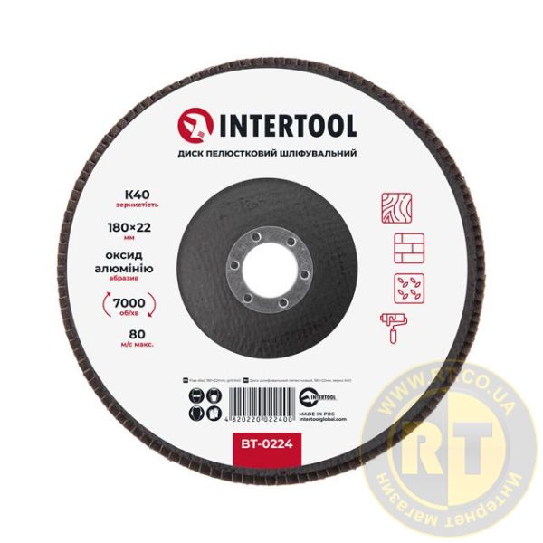 Диск шліфувальний пелюстковий, 180×22 мм, зерно K40, 7000 об/хв INTERTOOL BT-0224