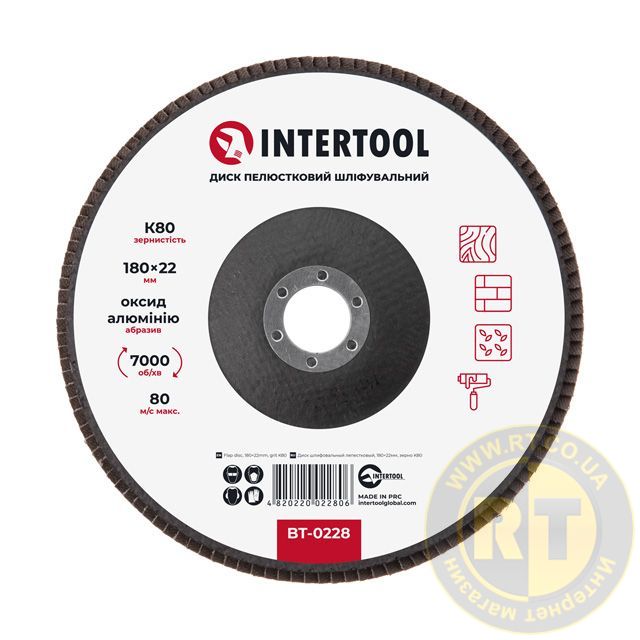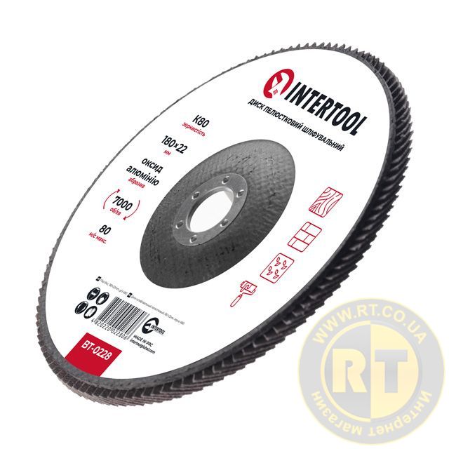 Диск шліфувальний пелюстковий, 180×22 мм, зерно K80, 7000 об/хв INTERTOOL BT-0228