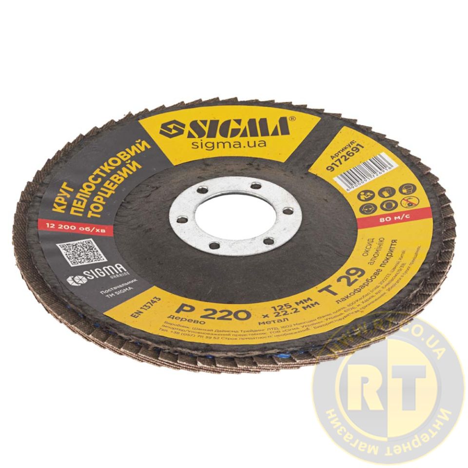 Круг пелюстковий торцевий Т29 (конічний) Ø125мм P220 SIGMA (9172691) призначений для плоского шліфування, обробки кромок зварних швів деталей та конструкцій з різних марок сталей, кольорових металів та деревини.
