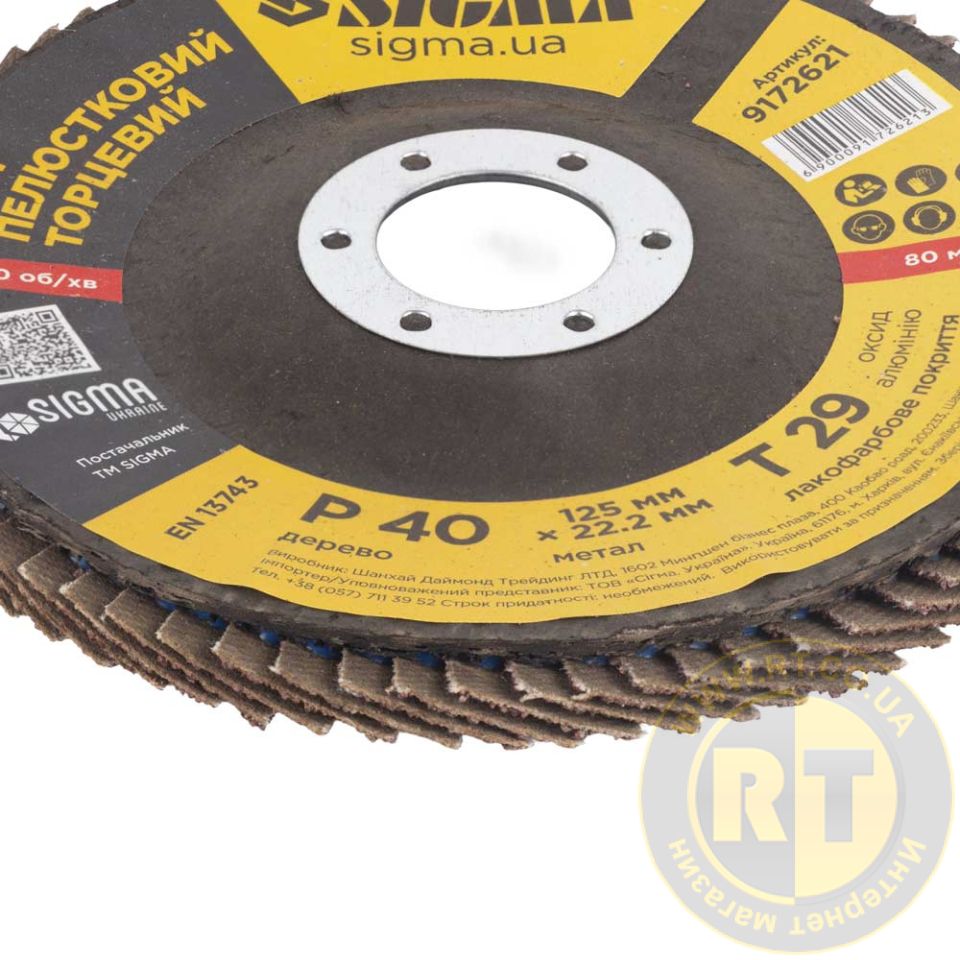 Круг пелюстковий торцевий Т29 (конічний) Ø125мм P40 SIGMA (9172621) призначений для плоского шліфування, обробки кромок зварних швів деталей та конструкцій з різних марок сталей, кольорових металів та деревини.