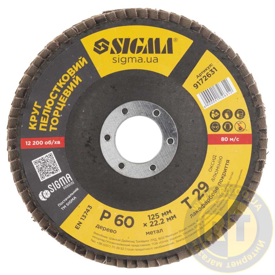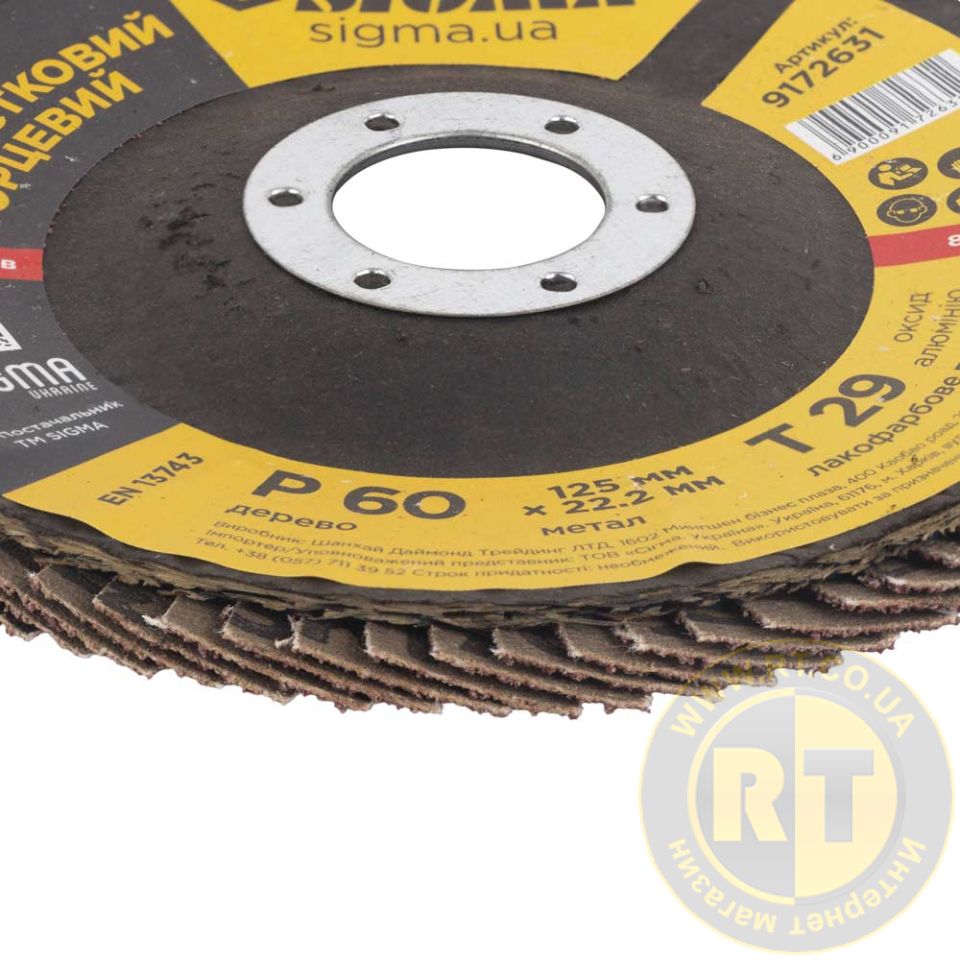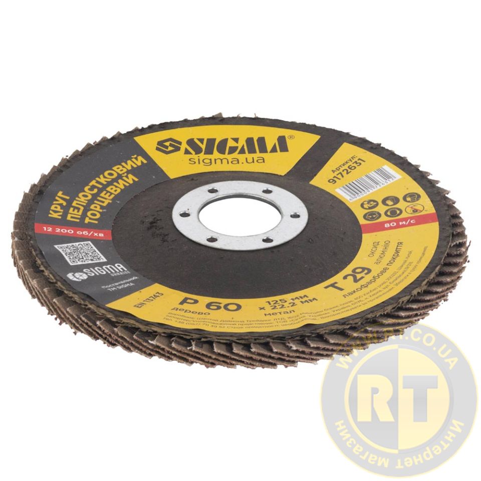 Круг пелюстковий торцевий Т29 (конічний) Ø125мм P60 SIGMA (9172631) призначений для плоского шліфування, обробки кромок зварних швів деталей та конструкцій з різних марок сталей, кольорових металів та деревини.
