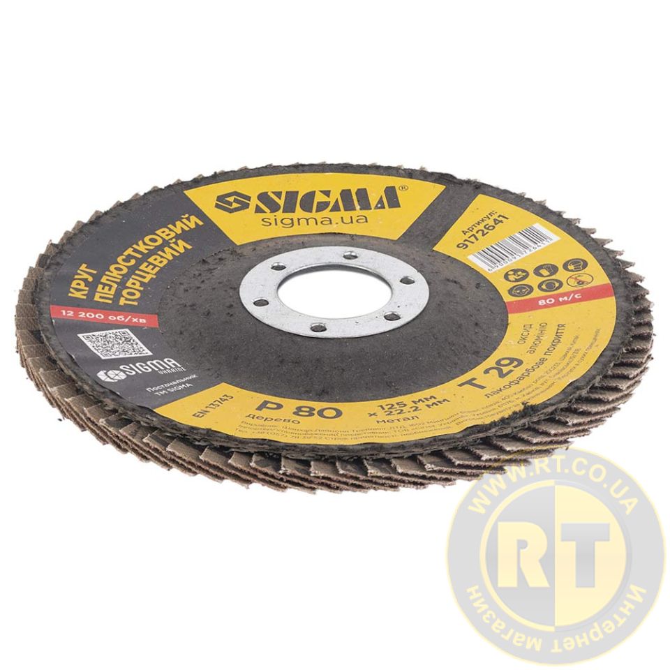 Круг пелюстковий торцевий Т29 (конічний) Ø125мм P80 SIGMA (9172641) призначений для плоского шліфування, обробки кромок зварних швів деталей та конструкцій з різних марок сталей, кольорових металів та деревини.