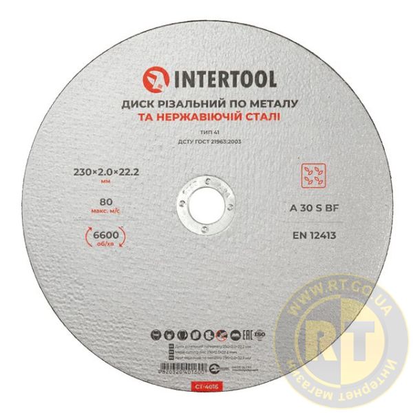 Диск відрізний по металу, 230×2,0×22,2 мм, 6600 об/хв INTERTOOL CT-4016