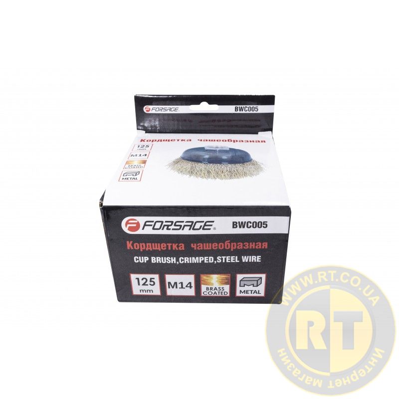 Щітка «чашка» Forsage F-BWC005 діаметром 125 мм, із щетиною із латунованого крученого дроту, встановлюється на вал УШМ за допомогою гайки М14. Призначена для зняття тонкого шару фарби або лаку, видалення іржі та забруднень. При рекомендованій швидкості обертання 6500 об/хв щіткою можна швидко обробляти ділянки великої площі.