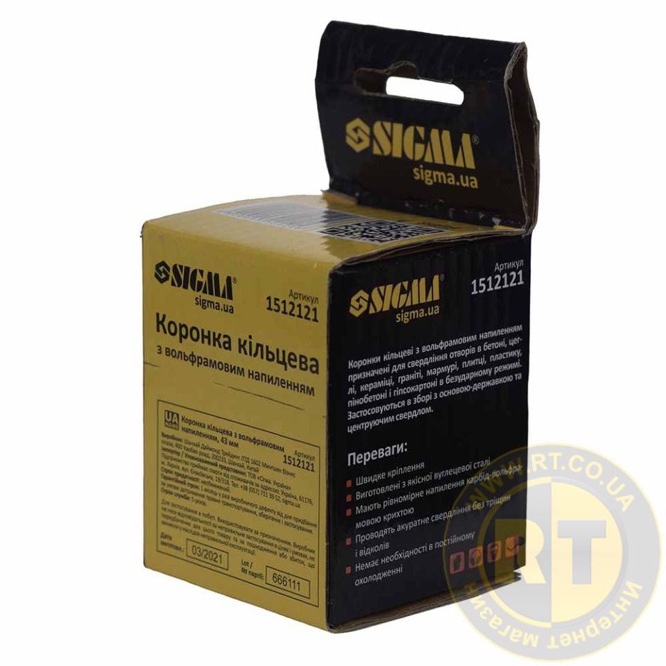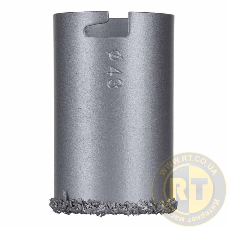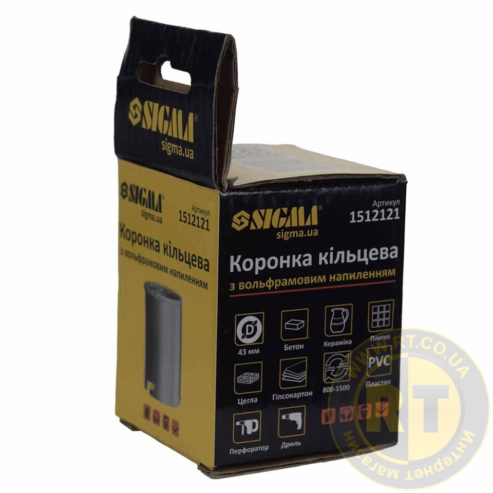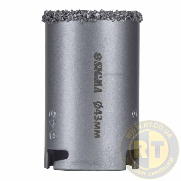 Коронка кільцева з вольфрамовим напиленням 43мм SIGMA (1512121) призначена для свердління отворів у бетоні, цегли, кераміці, граніті, мармурі, плитці, пластику, пінобетоні та гіпсокартоні в ненаголошеному режимі.