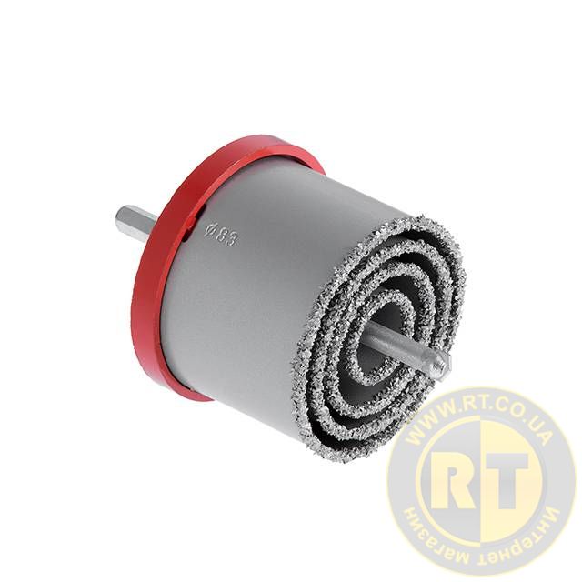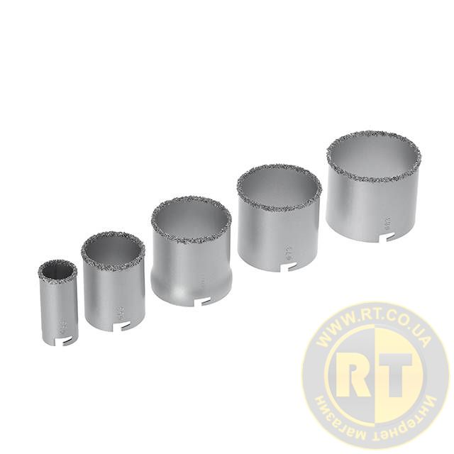 Край коронок вкритий карбід-вольфрамовою крихтою з товщиною шару 5 мм, що забезпечує комфортне свердління без сколів та тріщин. Глибина свердління складає 64 мм. Завдяки центруючому свердлу забезпечується точне позиціювання коронки під час свердління, що збільшує якість отворів.