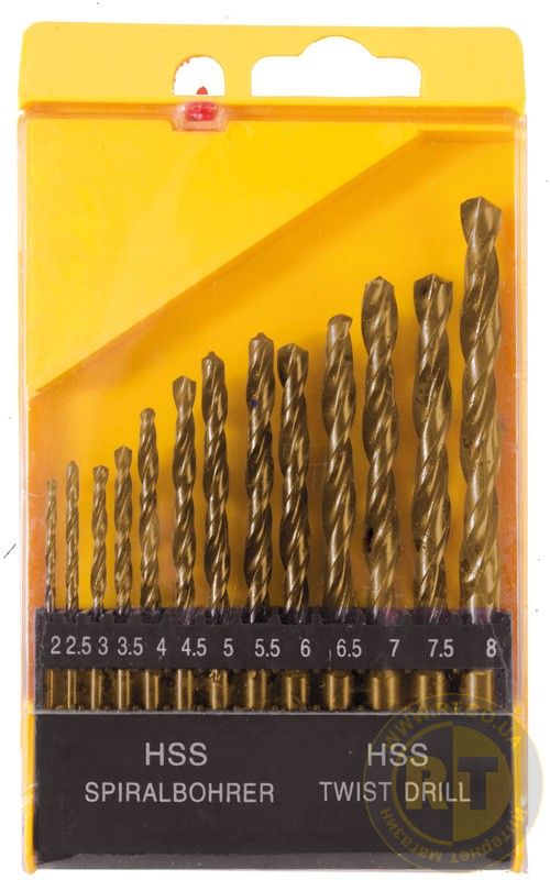 Набір свердл для металу HSS ТИТАН у пластиковому боксі – це практичний комплект із 13 свердлів діаметром від 2 до 8 мм. Свердла виготовлені з швидкорізальної сталі (HSS) з титановим покриттям, що забезпечує: