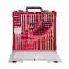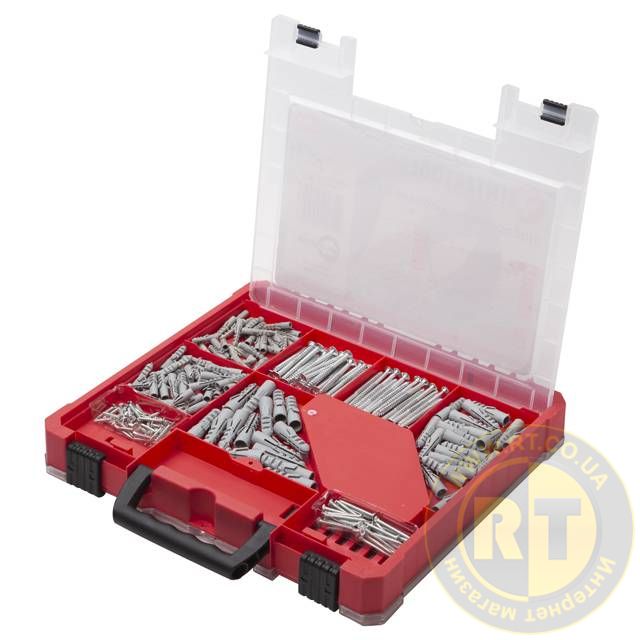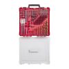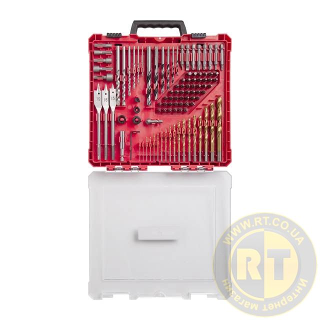Свердла та насадки розміщені у зручному та міцному пластиковому кейсі з замками. Кожен елемент міцно закріплений на своєму посадковому місці, що перешкоджає випаданню інструменту. Дозволяє комфортно переносити та зберігати весь набір.