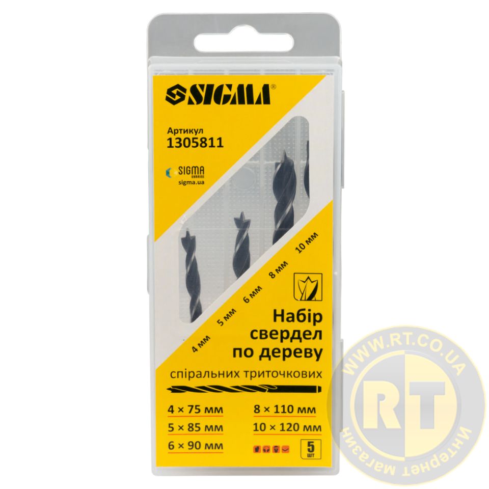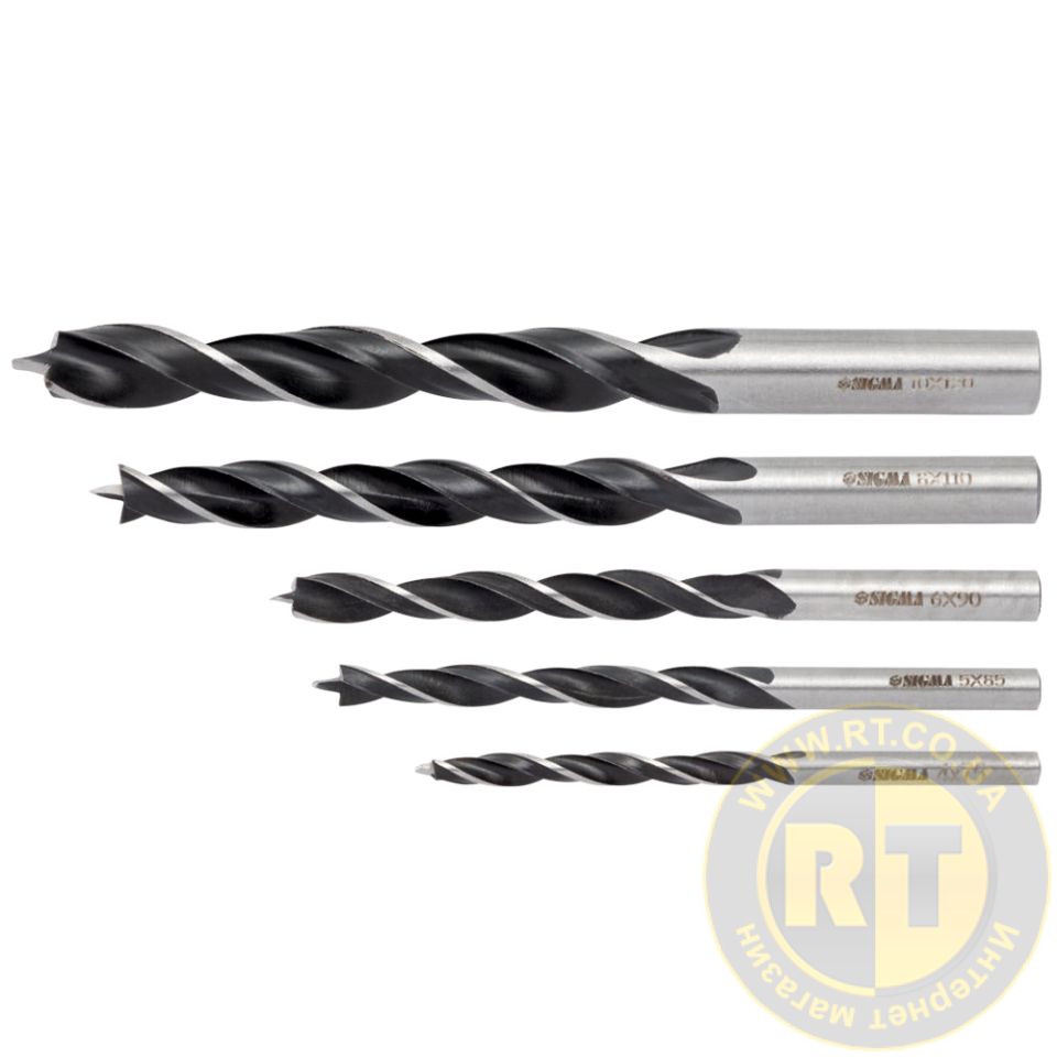 Набір свердел по дереву спіральних триточкових 5шт (4×75мм, 5×85мм, 6×90мм, 8×110мм, 10×120мм) SIGMA 1305811
