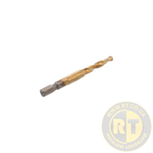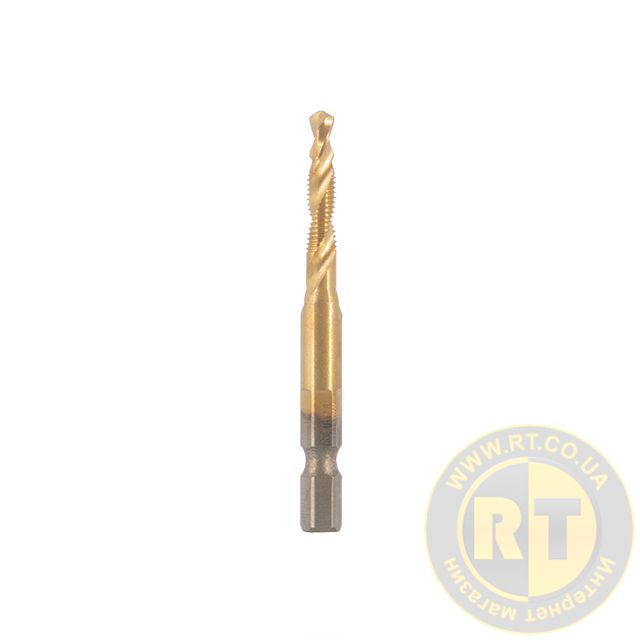 Свердло-мітчик призначене для свердління та нарізання різьби в металі. Свердло виготовлене зі швидкорізальної сталі, при цьому поверхня робочої зони вкрита нітридом титану. Таке покриття підвищує зносостійкість різальних кромок та захищає від механічних пошкоджень.