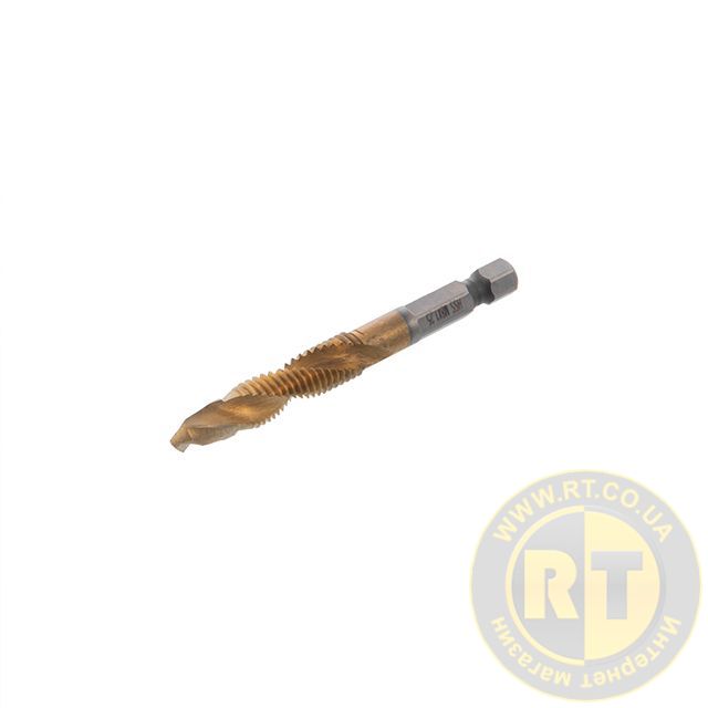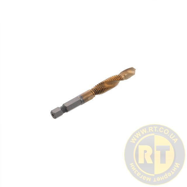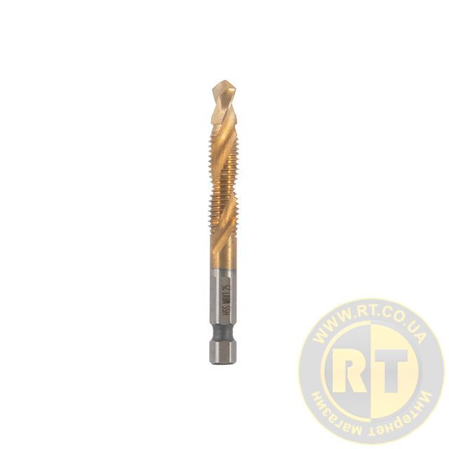 Свердло-мітчик призначене для свердління та нарізання різьби в металі. Свердло виготовлене зі швидкорізальної сталі, при цьому поверхня робочої зони вкрита нітридом титану. Таке покриття підвищує зносостійкість різальних кромок та захищає від механічних пошкоджень.