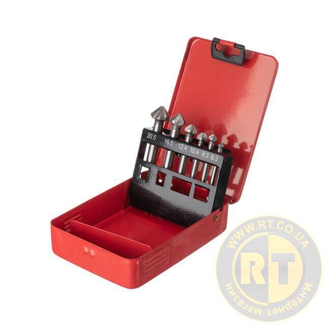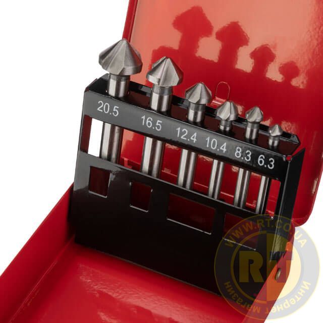 Оптимальне відведення стружки і додавання охолоджувальних рідин у процесі роботи збільшує строк служби інструментів. В комплекті 6 зенкерів: 6.3, 8.3, 10.4, 12.4, 16.5 і 20.5 мм.