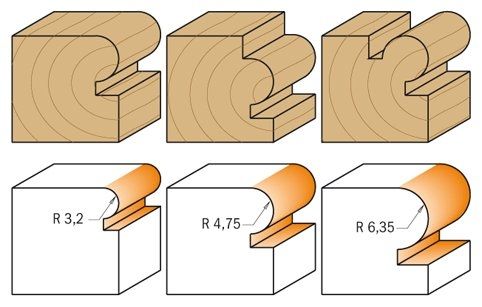 Фреза призначена для заокруглення країв. Оснащена підшипником, твердосплавними ріжучими гранями, обмежувачем подачі та PTFE покриттям. Для створення заокругленого угла необхідно