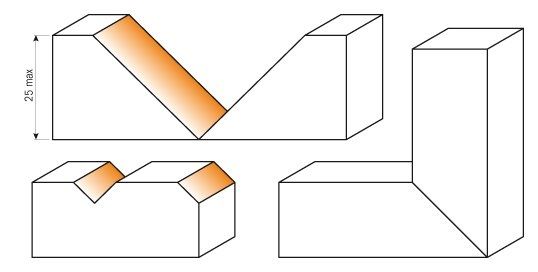 ПРИМІТКА: Фреза V-подібного профілю забезпечує широкі можливості фрезерування (гравіювання) під кутом. Фреза із чотири-сторонніми змінними ножами VHM може використовуватись для обробки таких матеріалів як: ДСП, фанери, ламінату, МДФ.