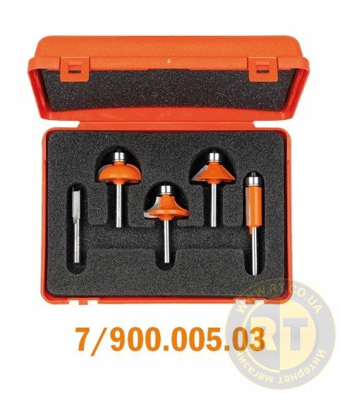 Набір із п'яти найбільш популярних прямих пазових фрез, упакованих у пластиковий помаранчевий кейс. Фреза виконана з міцного твердосплаву з помаранчевим покриттям PFTE