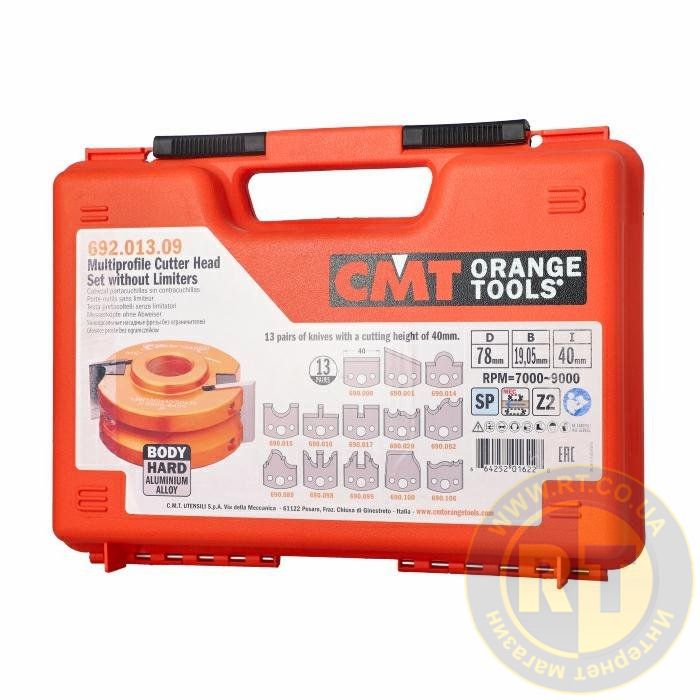 Компанія CMT пропонує 13 різних профілів ножів для професійної обробки. Дані ножі допоможуть виготовити з'єднання, рами, заокруглення чи пазі. Спеціальна будова фрези забезпечить можливість використання в ній ножів заввишки 40мм чи 50мм. Комплект продається в зручному та міцному пластиковому кейсі.