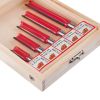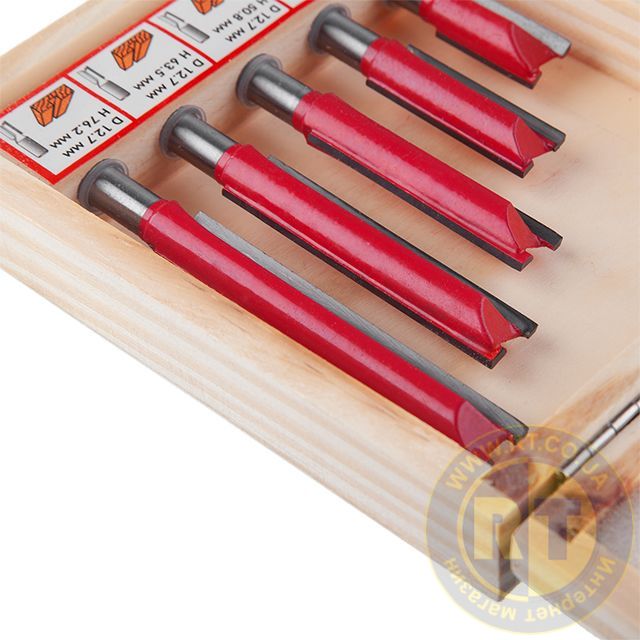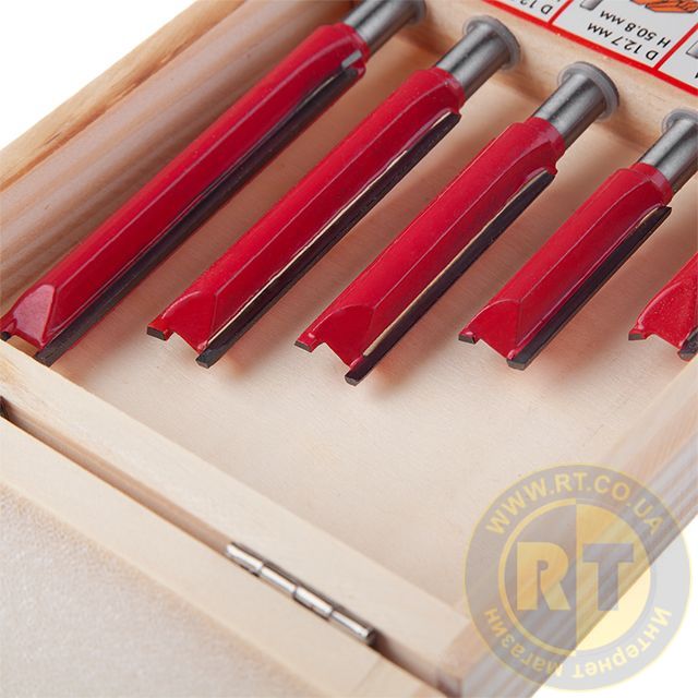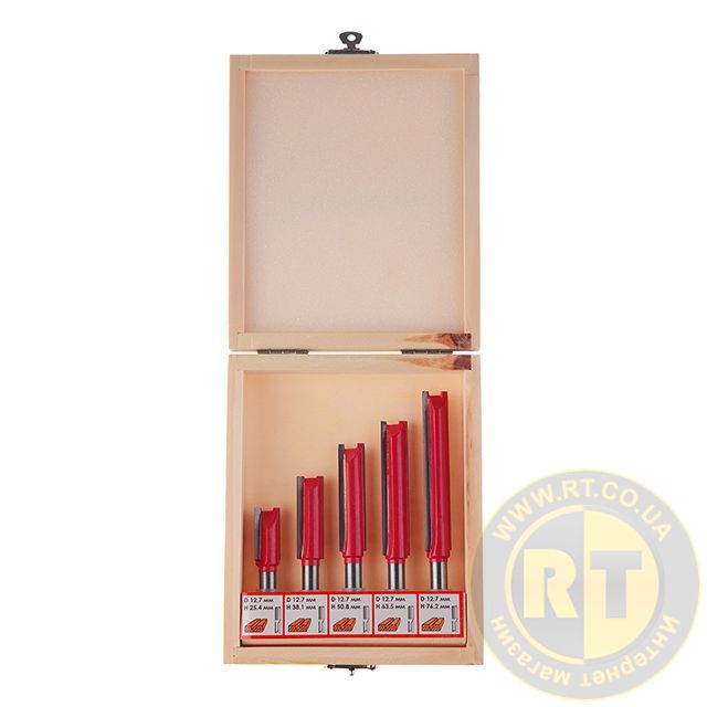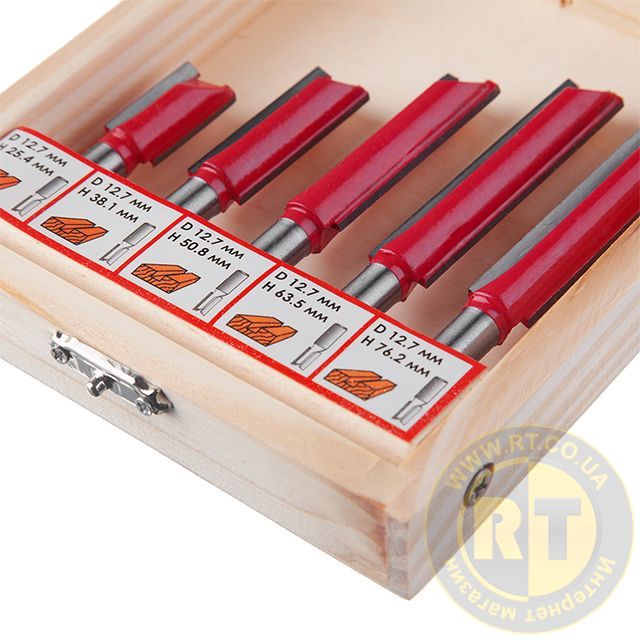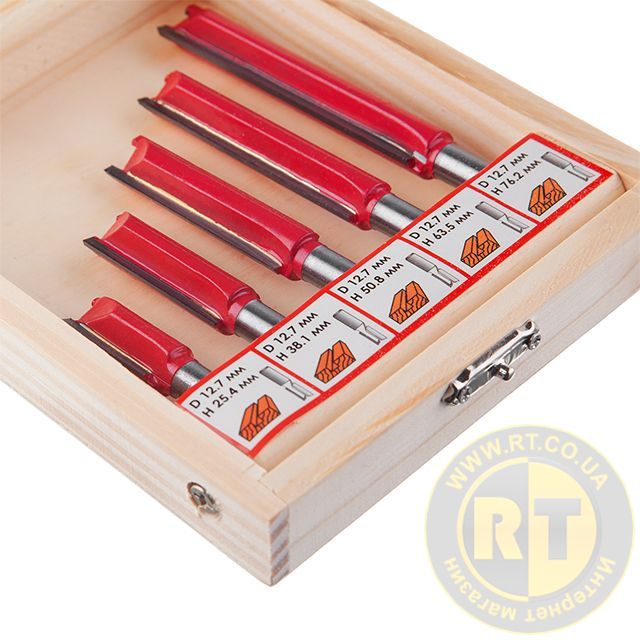 Даний набір містить 5 фрез, діаметром 12,7 мм, різної довжини: 25.4; 38.1; 50.8; 63.5; 76 мм. Фрези працюють з дерев'яним брусом, товстою фанерою або листами МДФ, робить зріз потрібного діаметра гладким і без сколів. Бічні різці підрізають волокна по краю, після чого ріжуча крайка рівно зрізує сам матеріал без деформації. Це робить отвір гладким без додаткових зусиль та витрат. Різак плавно входить у заготовку, забезпечуючи чистоту та відсутність скалок.