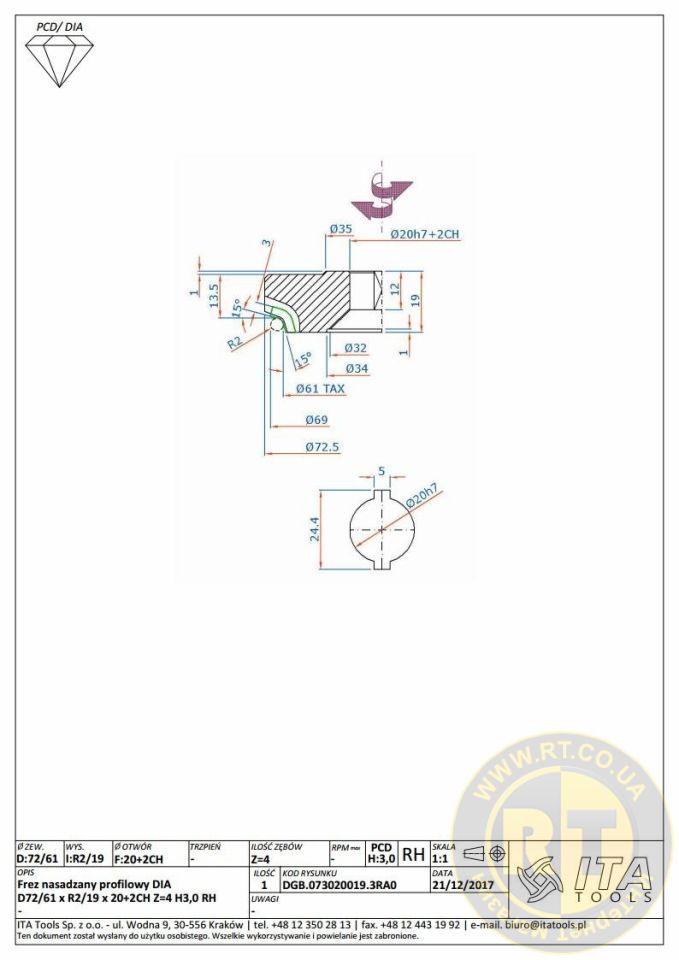DGB.Фреза насадна D=72,5/61 I=19 F=20+2CH Z=4 H3,0 R2 RH Holz-her FF701/1833 ITA TOOLS DGB.073020019.