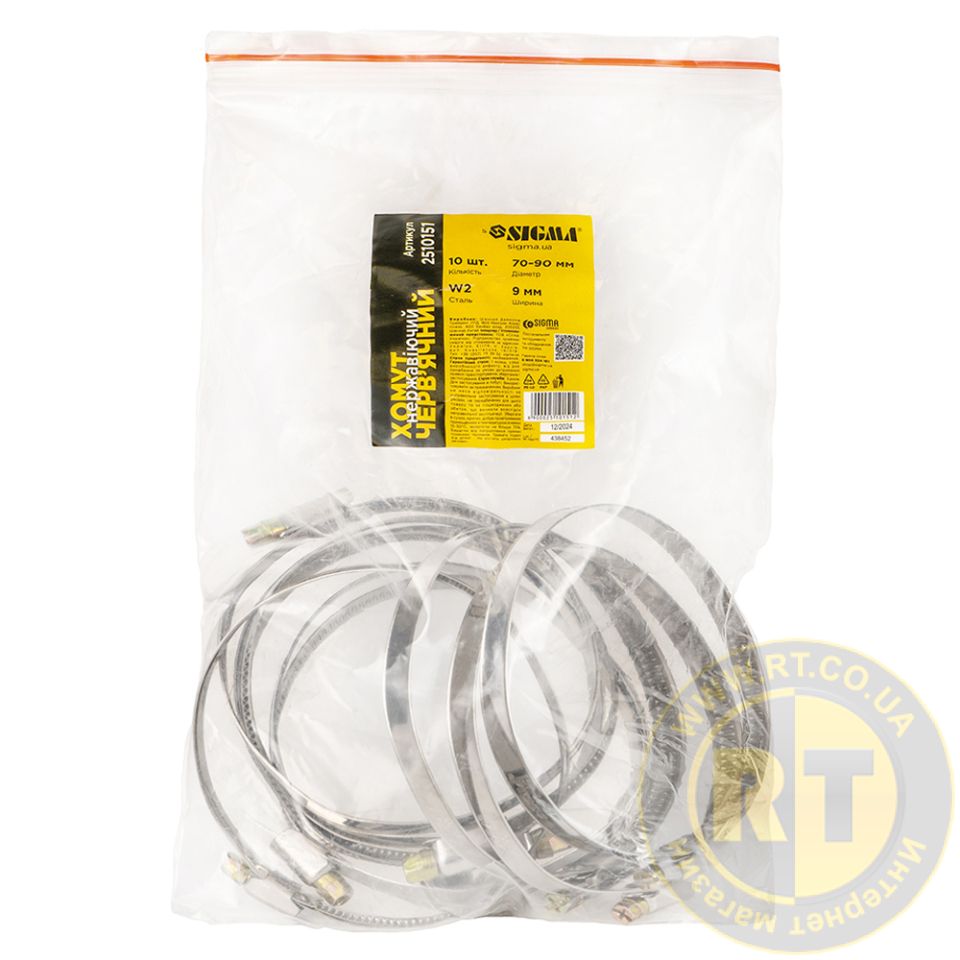 Хомут черв'ячний нержавіючий 9мм D70-90мм 10шт SIGMA 2510151