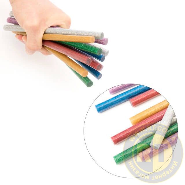 Кольорові клейові стержні з блискітками, в комплекті 6 кольорів: срібло, золото, червоний, бузковий, зелений, синій. Діаметр стрижня 7,4 мм - один із найпоширеніших і найпопулярніших розмірів, підходить до будь-яких марок клейових пістолетів. Сам стрижень довжиною 200 мм, в упаковці - 12 штук.