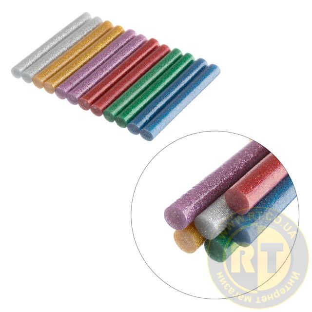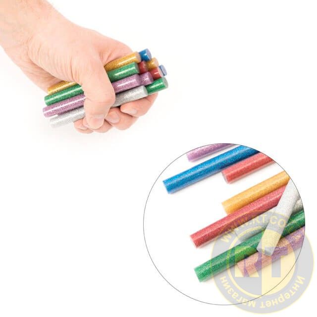 Кольорові клейові стержні з блискітками, в комплекті 6 кольорів: срібло, золото, червоний, бузковий, зелений, синій. Діаметр стрижня 11,2 мм - один із найпоширеніших і найпопулярніших розмірів, підходить до будь-яких марок клейових пістолетів. Сам стрижень довжиною 100 мм, в упаковці - 12 штук.