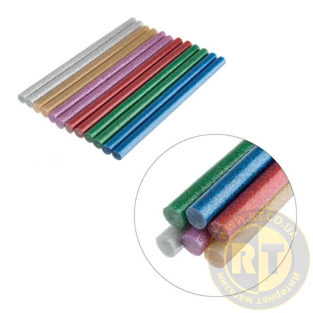 Кольорові клейові стержні з блискітками, в комплекті 6 кольорів: срібло, золото, червоний, бузковий, зелений, синій. Діаметр стрижня 7,4 мм - один із найпоширеніших і найпопулярніших розмірів, підходить до будь-яких марок клейових пістолетів. Сам стрижень довжиною 200 мм, в упаковці - 12 штук.