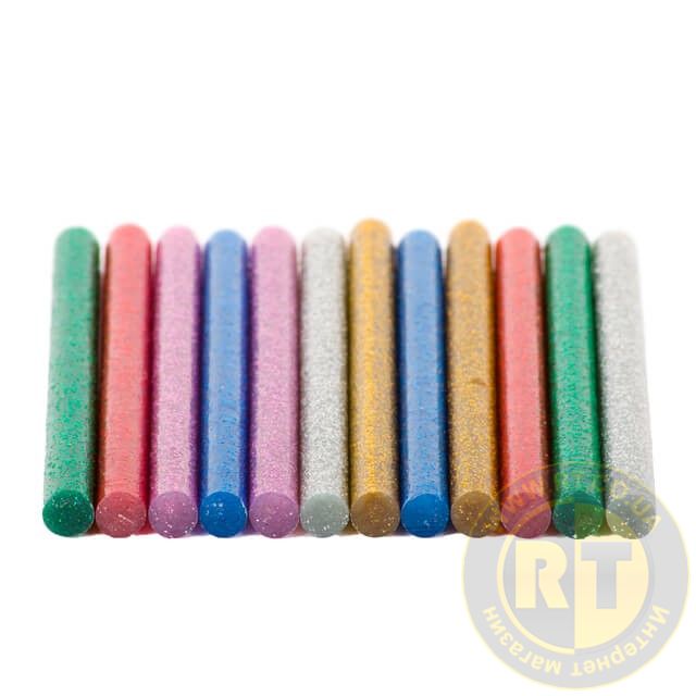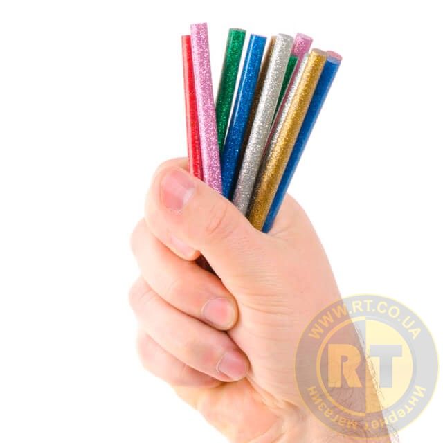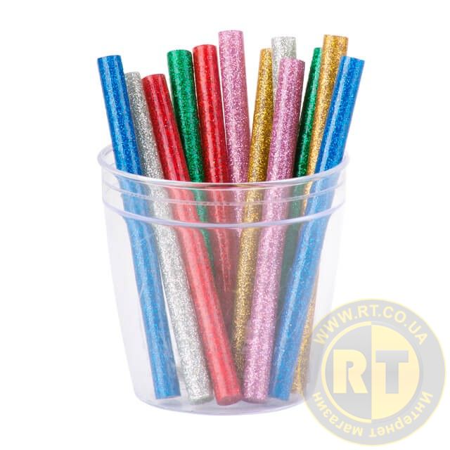 Кольорові клейові стержні з блискітками, в комплекті 6 кольорів: срібло, золото, червоний, бузковий, зелений, синій. Діаметр стрижня 7,4 мм - один із найпоширеніших і найпопулярніших розмірів, підходить до будь-яких марок клейових пістолетів. Сам стрижень довжиною 100 мм, в упаковці - 12 штук.